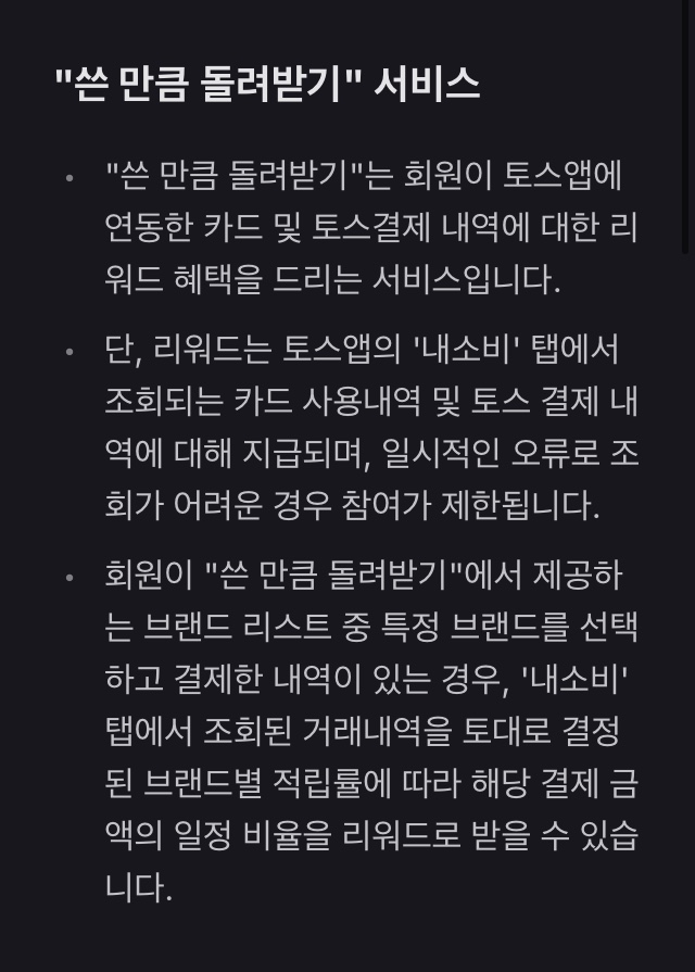 토스에는 결제내역을 토대로 "쓴 만큼 돌려받기"라는 리워드를 주는 서비스가 있다.