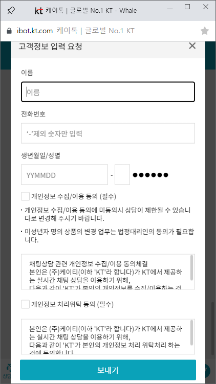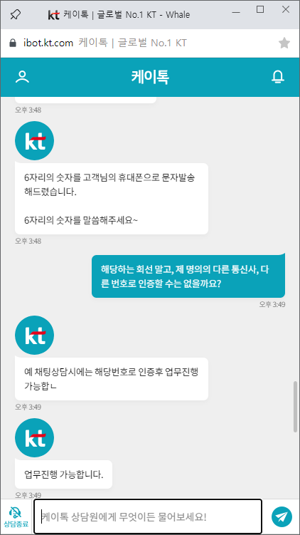 알고 봤더니, kt도 엘지유플러스와 마찬가지로 채팅상담 서비스를 시행하고 있다.