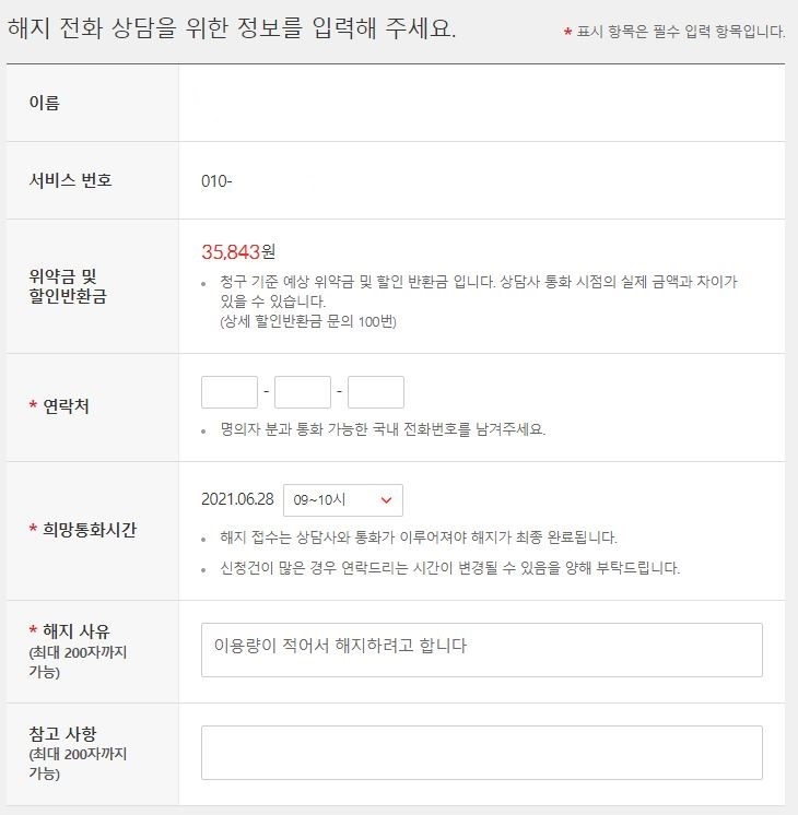 4. 다회선인 경우, "서비스 번호"가 해지하려는 번호가 맞는지 확인한다.