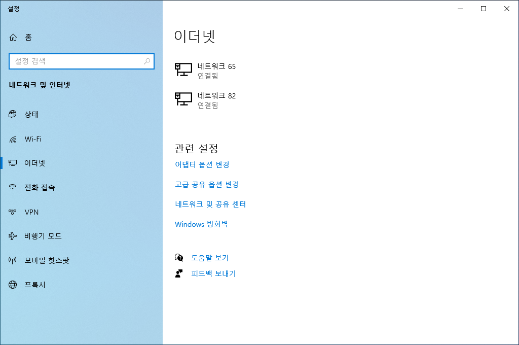 궁금해서 이더넷 어댑터를 살펴봤더니, 실제로는 두 개의 네트워크를 모두 인식하는 상태이다.