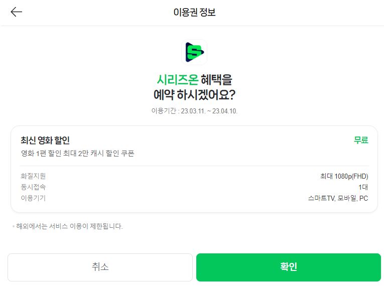 시리즈온 혜택은 다시 2가지로 나뉘는데, 한 가지는 '최신 영화 할인'이고, 다른 하나는 '영화 무제한'이다.