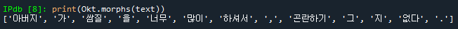 okt.morphs() 텍스트를 형태소 단위로 구분하며, 옵션으로 '정규화(norm)'와 '토큰화(tokenization', '어근화(stem)', '어구 추출(phrase extraction)'을 지원한다.