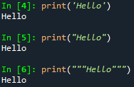 문자열은 ' ' (작은 따옴표), " " (큰 따옴표), ''' ''' (작은 따옴표 3개), """ """ (큰 따옴표 3개)으로 작성 가능하다.