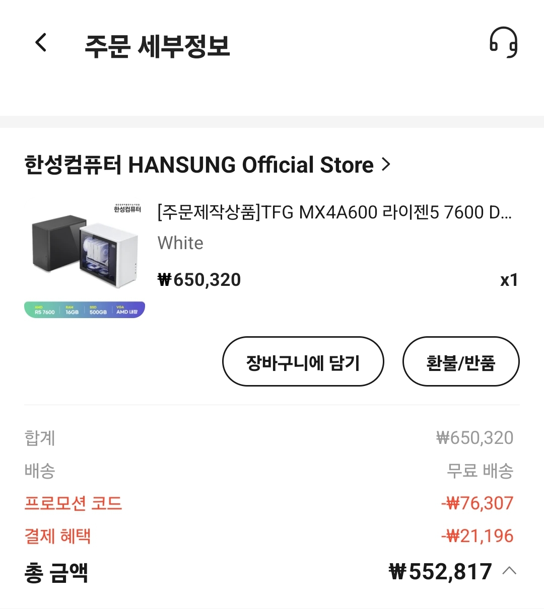 내 경우는 한성컴퓨터 데스크탑 TFG MX4A600의 구매가격이 552,817원.