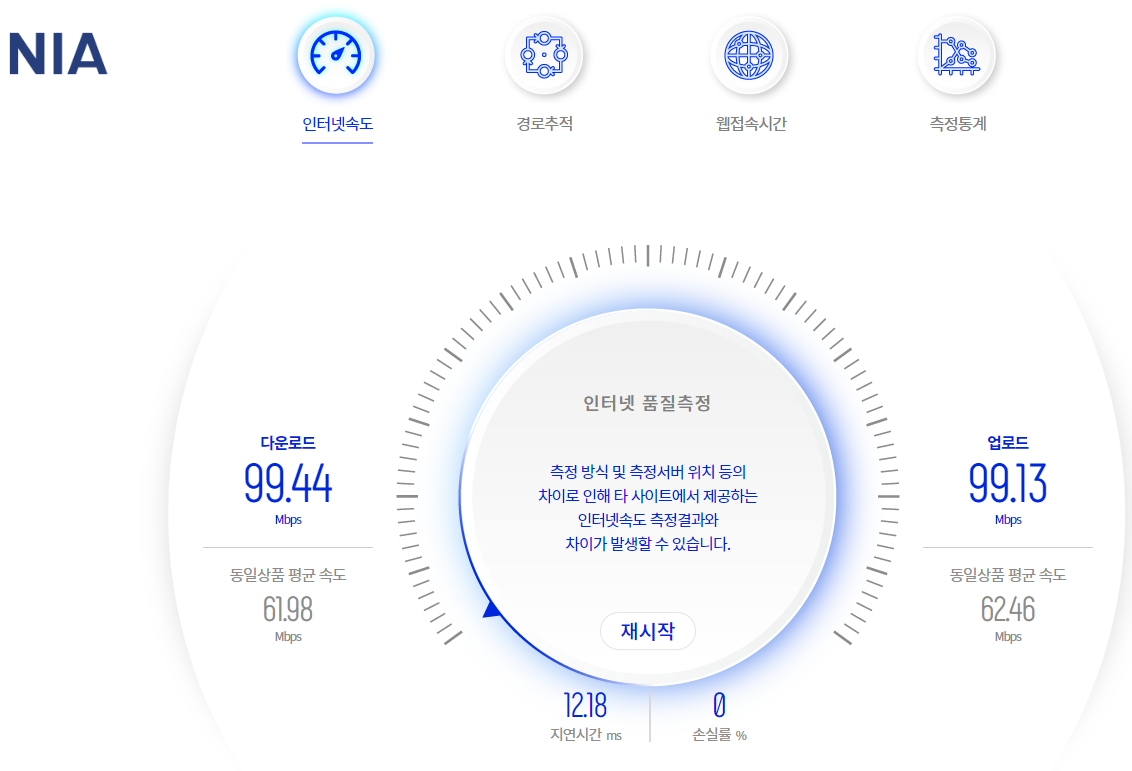 Wi-Fi 5, 5GHz, 11ac (최대 867Mbps)에서 다운로드 99Mbps, 업로드 99Mbps 속도가 나온다.