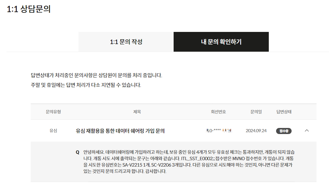 그래서 접수해둔 문의글과는 별개로, 데이터쉐어링 개통을 시도하였다.