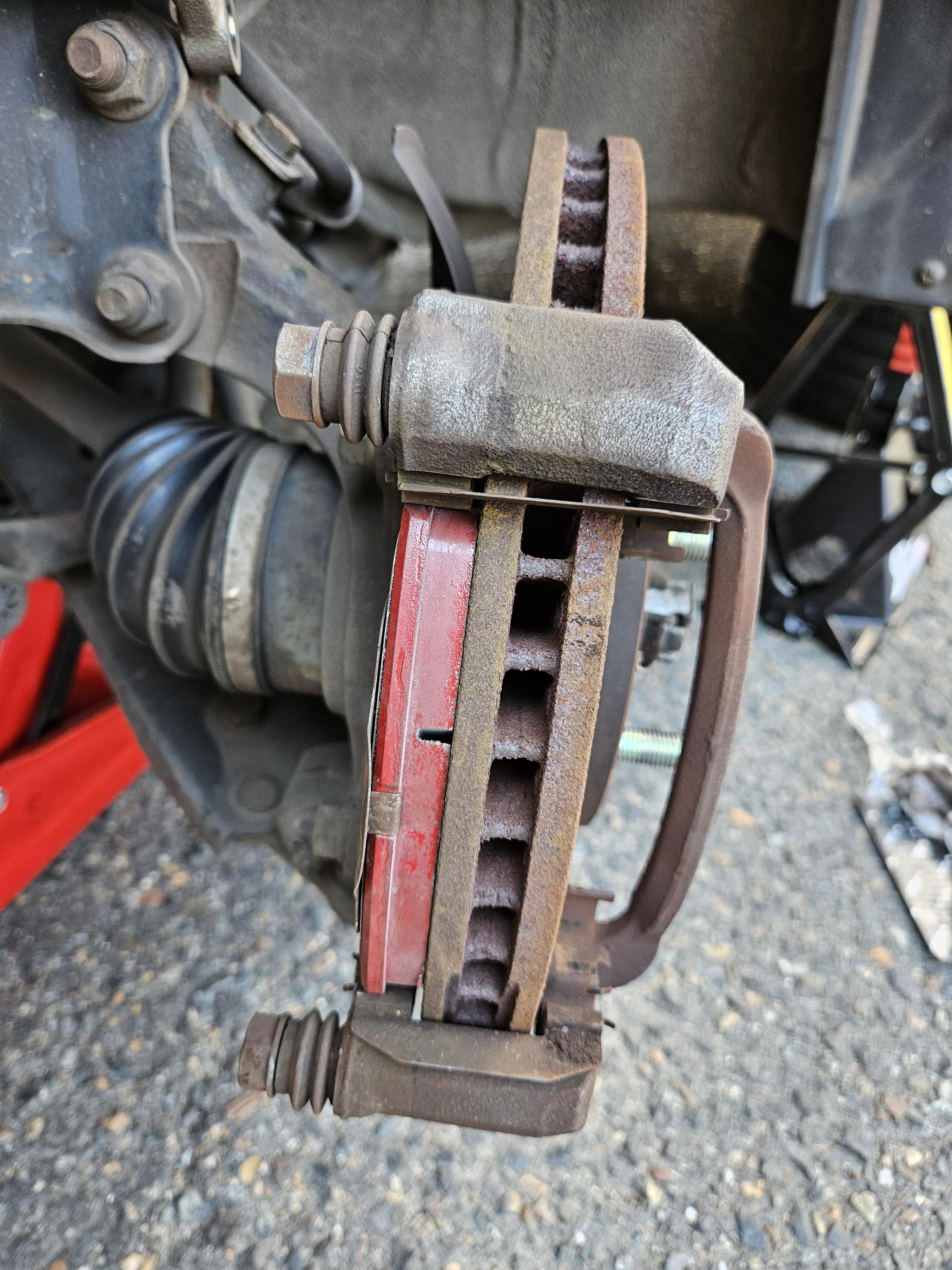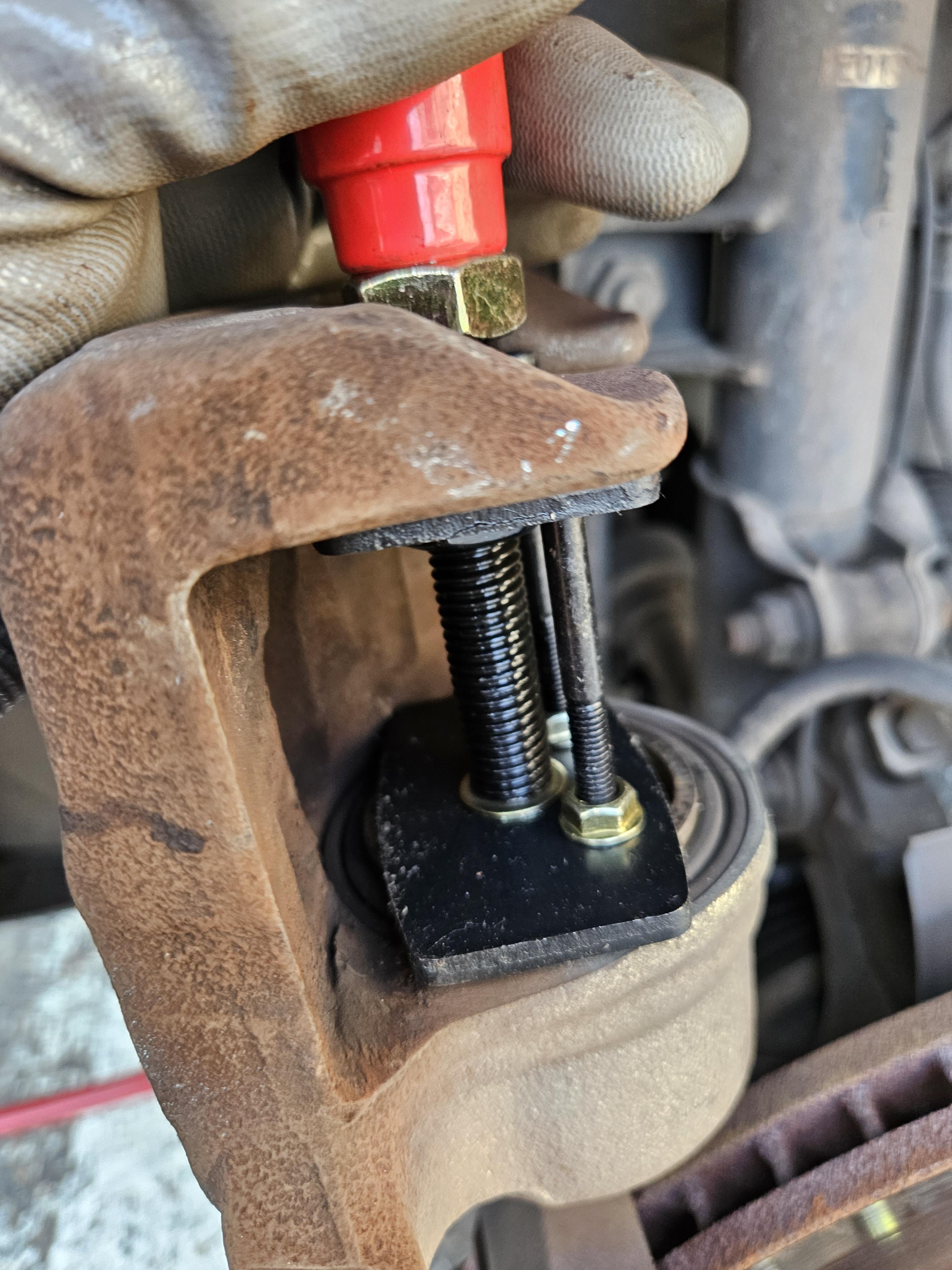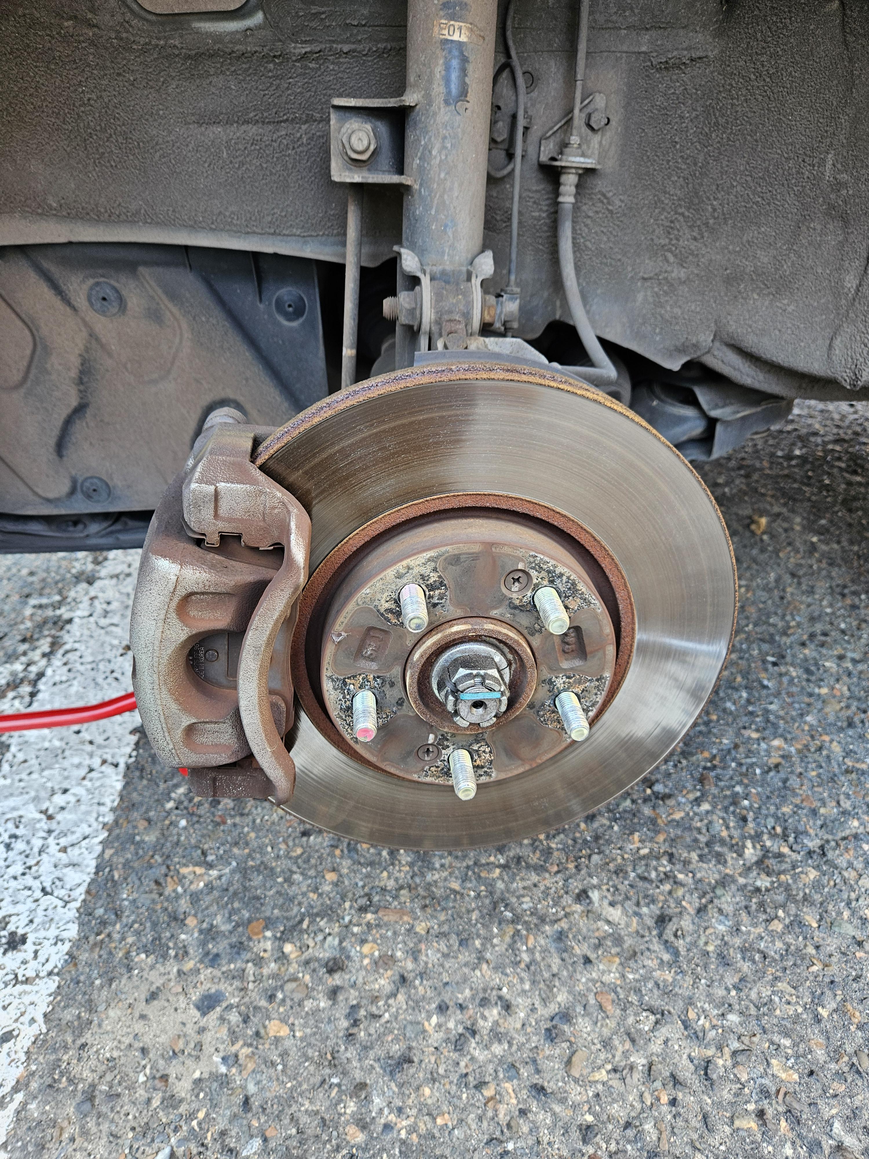 그래서 유압작기로 디스크 로터를 충분히 받혀 올려주자, 볼트를 끼워 넣을 수 있었다.