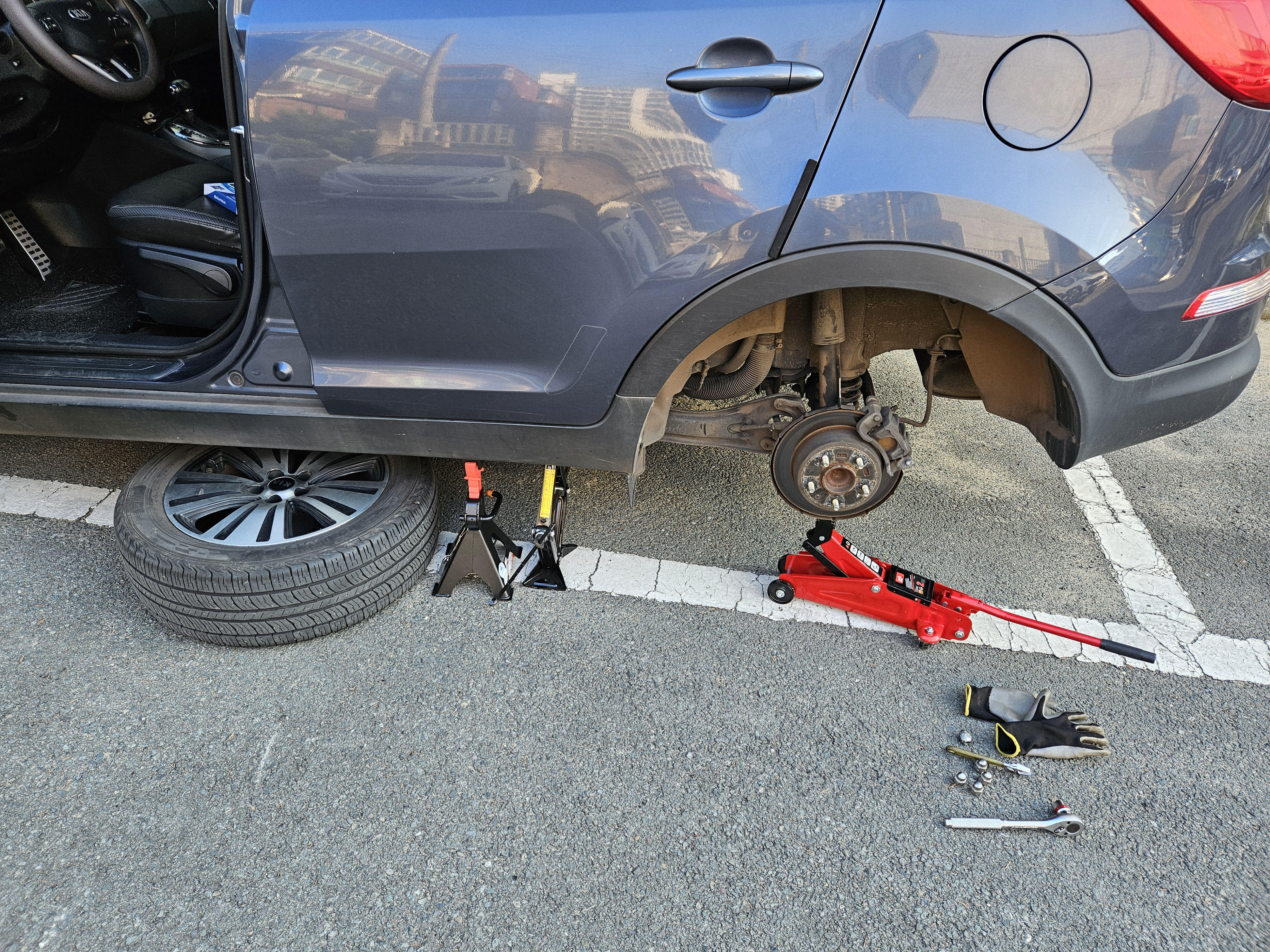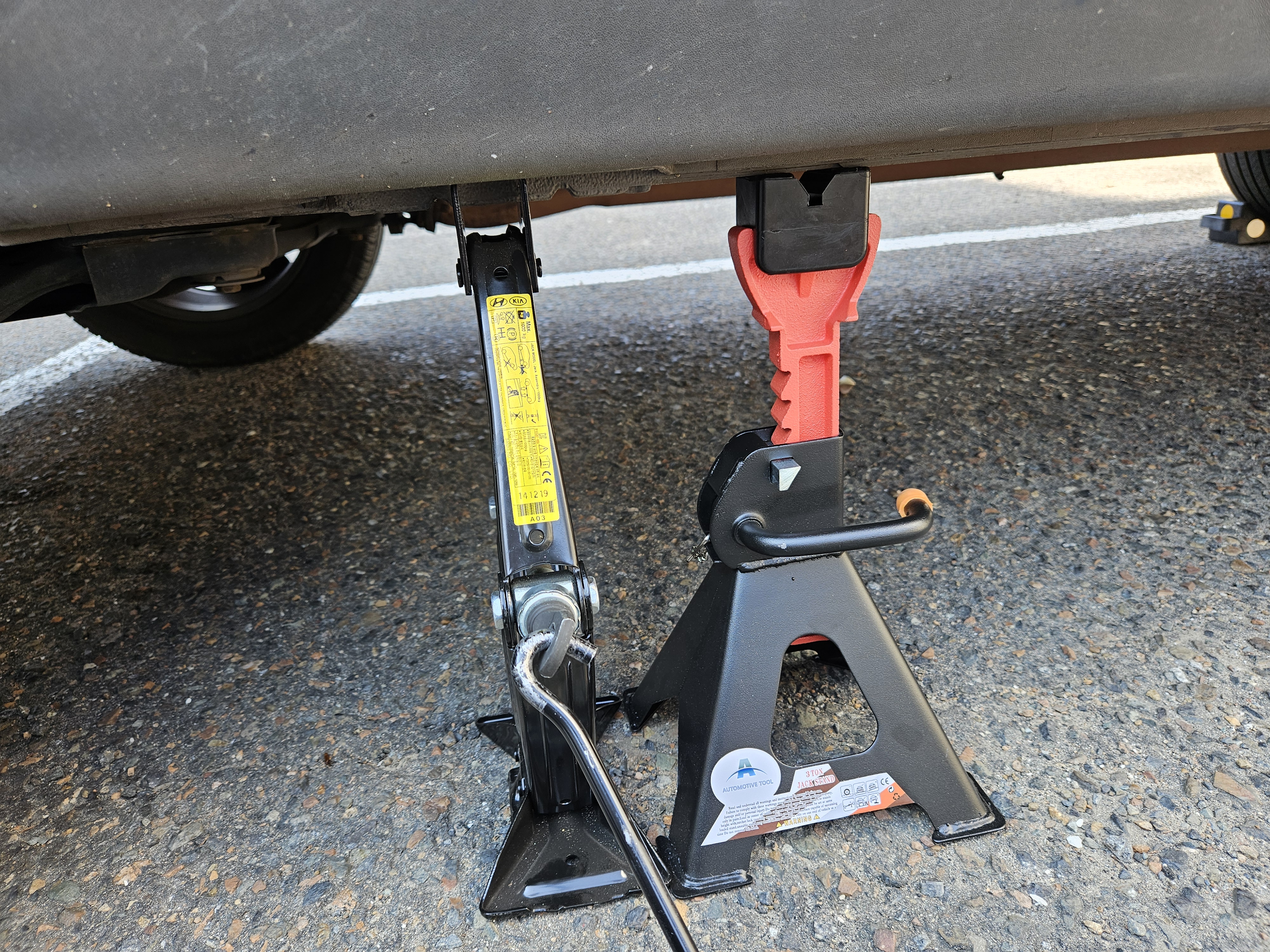열심히 OVM 잭을 돌려 차체를 띄우고, 안전 말목을 댔다.