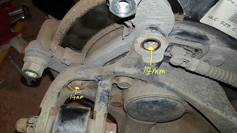 라쳇 렌치는 14mm 소켓으로 변경 후, 캘리퍼의 두 곳에 있는 너트를 풀어준다.