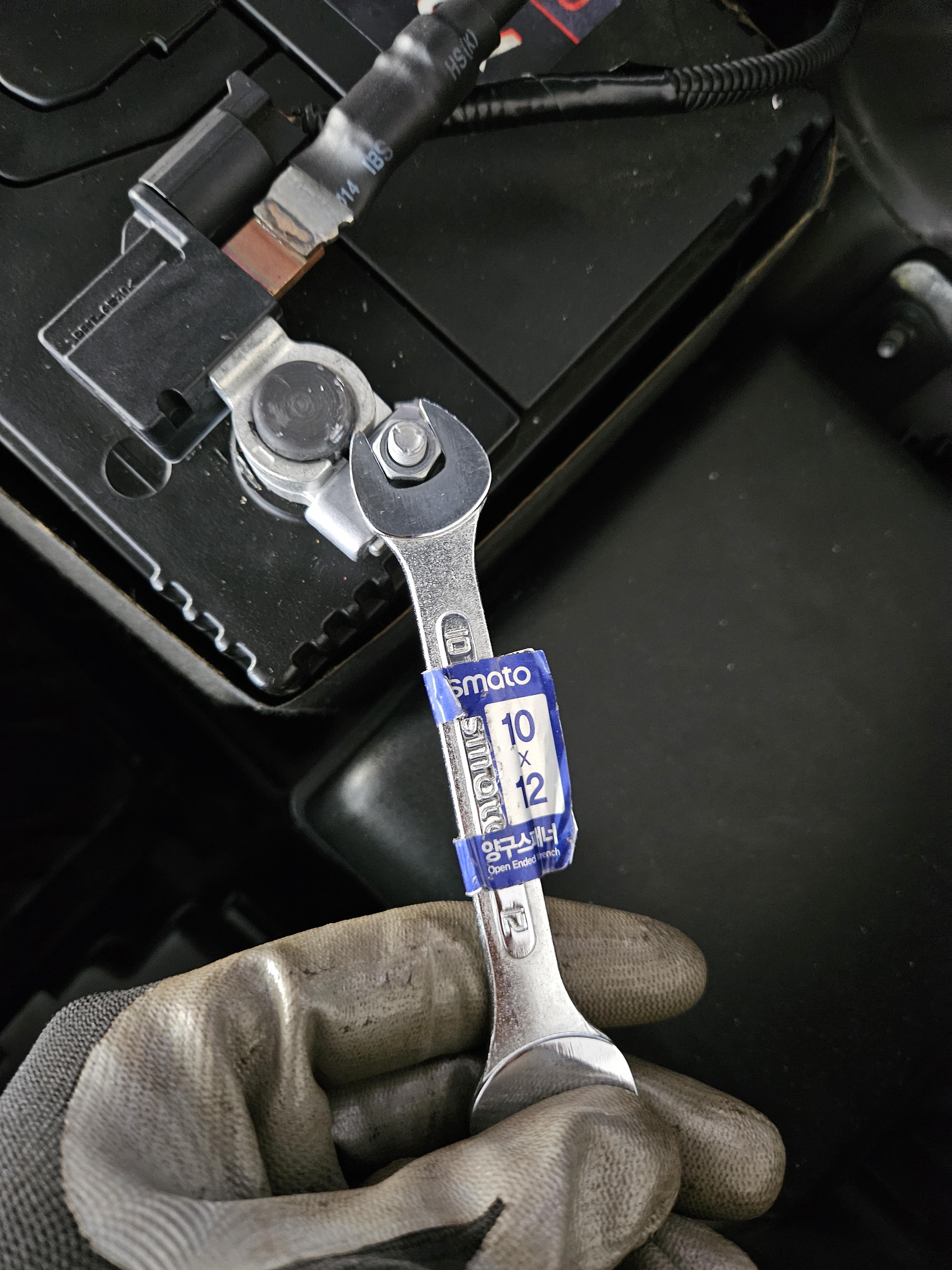 마이너스(-) 단자는 10mm로 너트를 풀면 되고, 플러스(+) 단자는 10mm와 12mm 너트가 둘 다 있다.