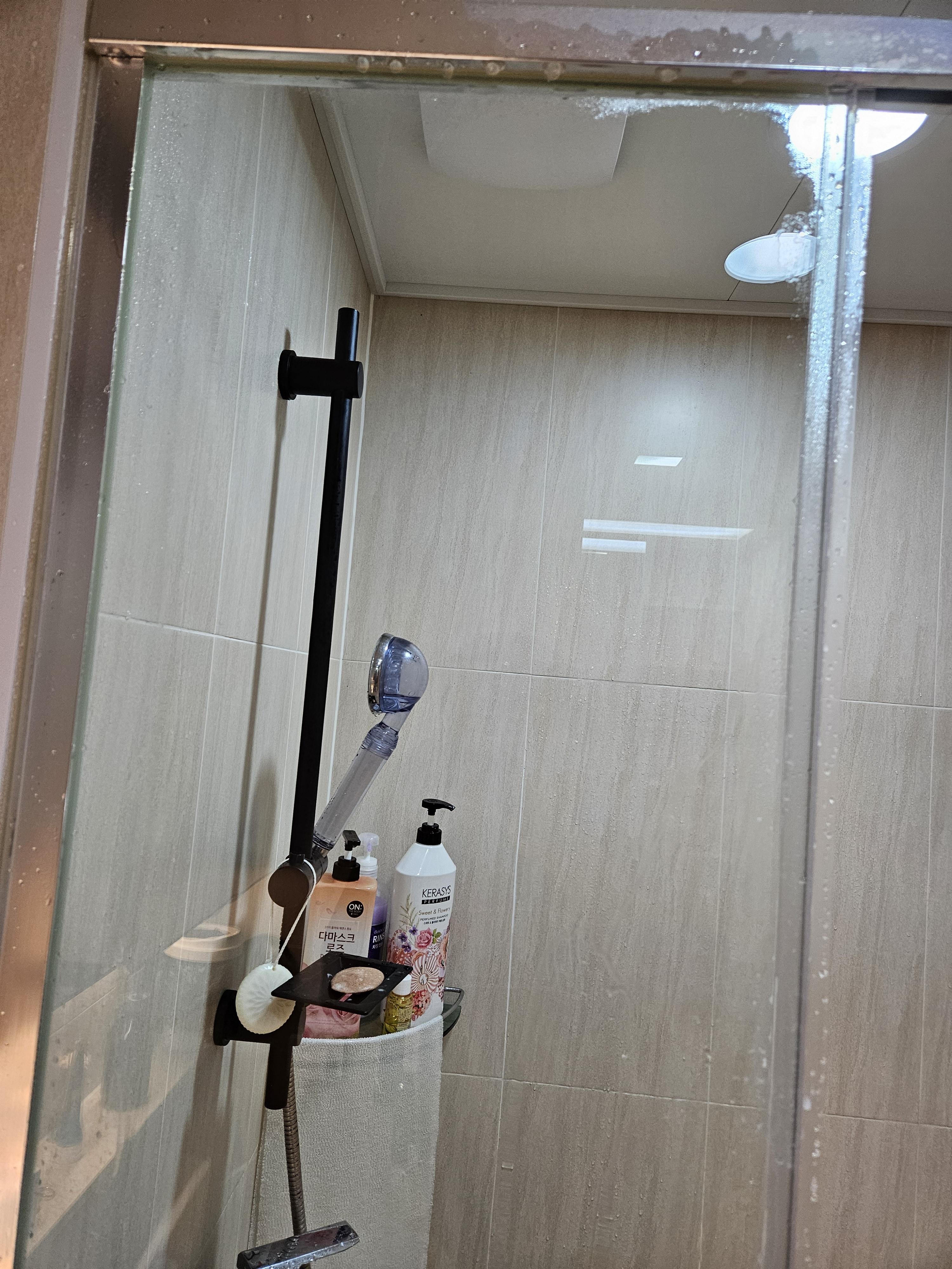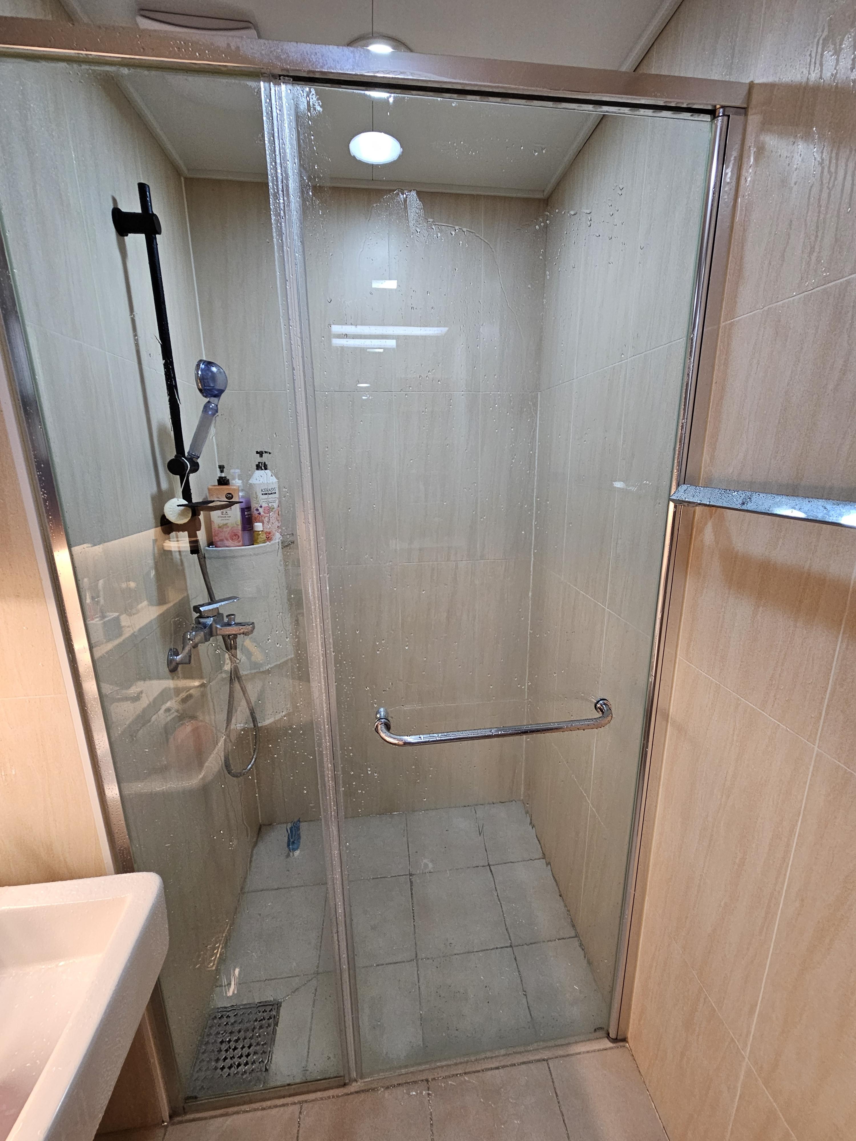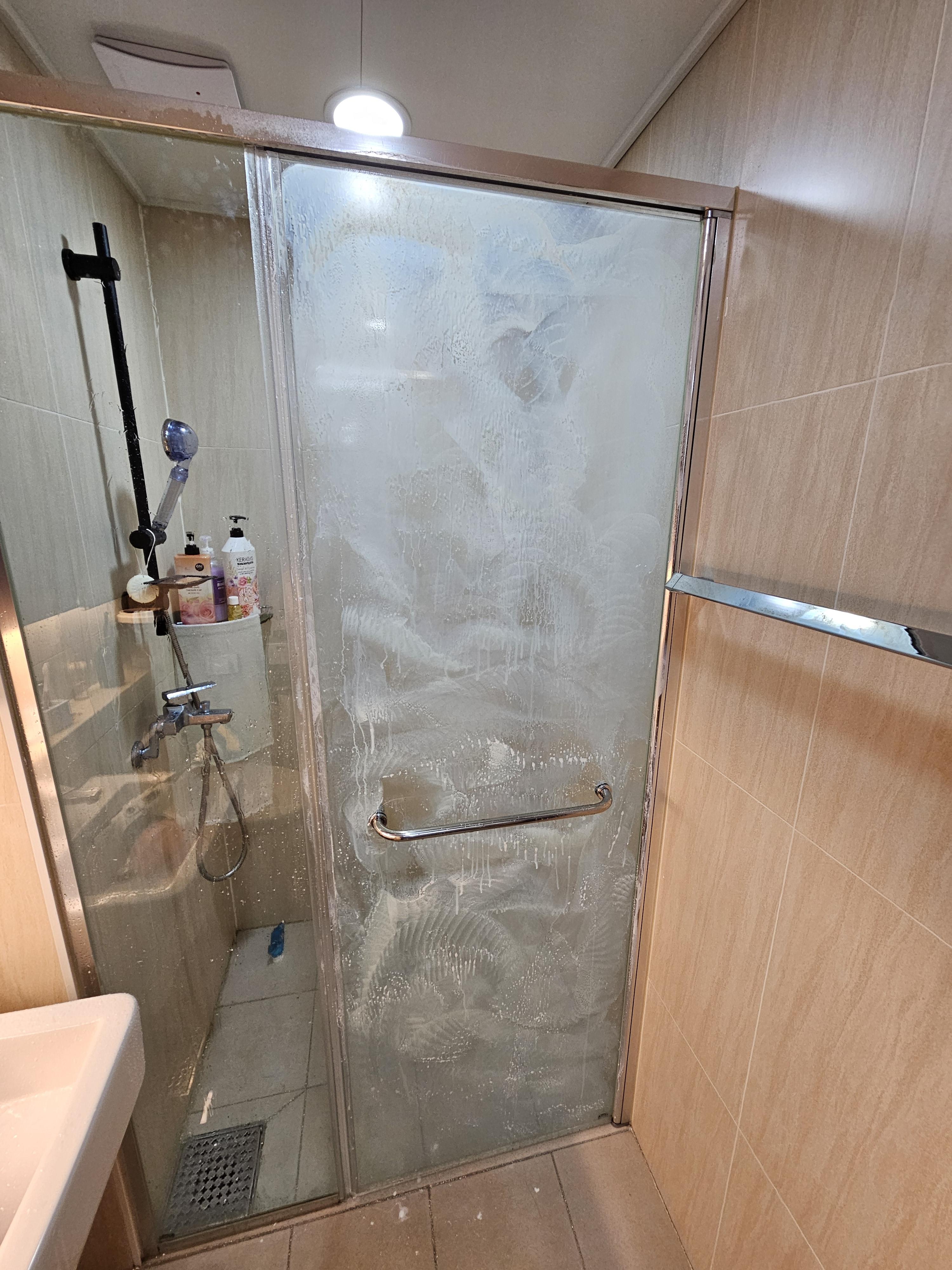 1. 먼저 샤워부스 유리에 물을 뿌려주기
