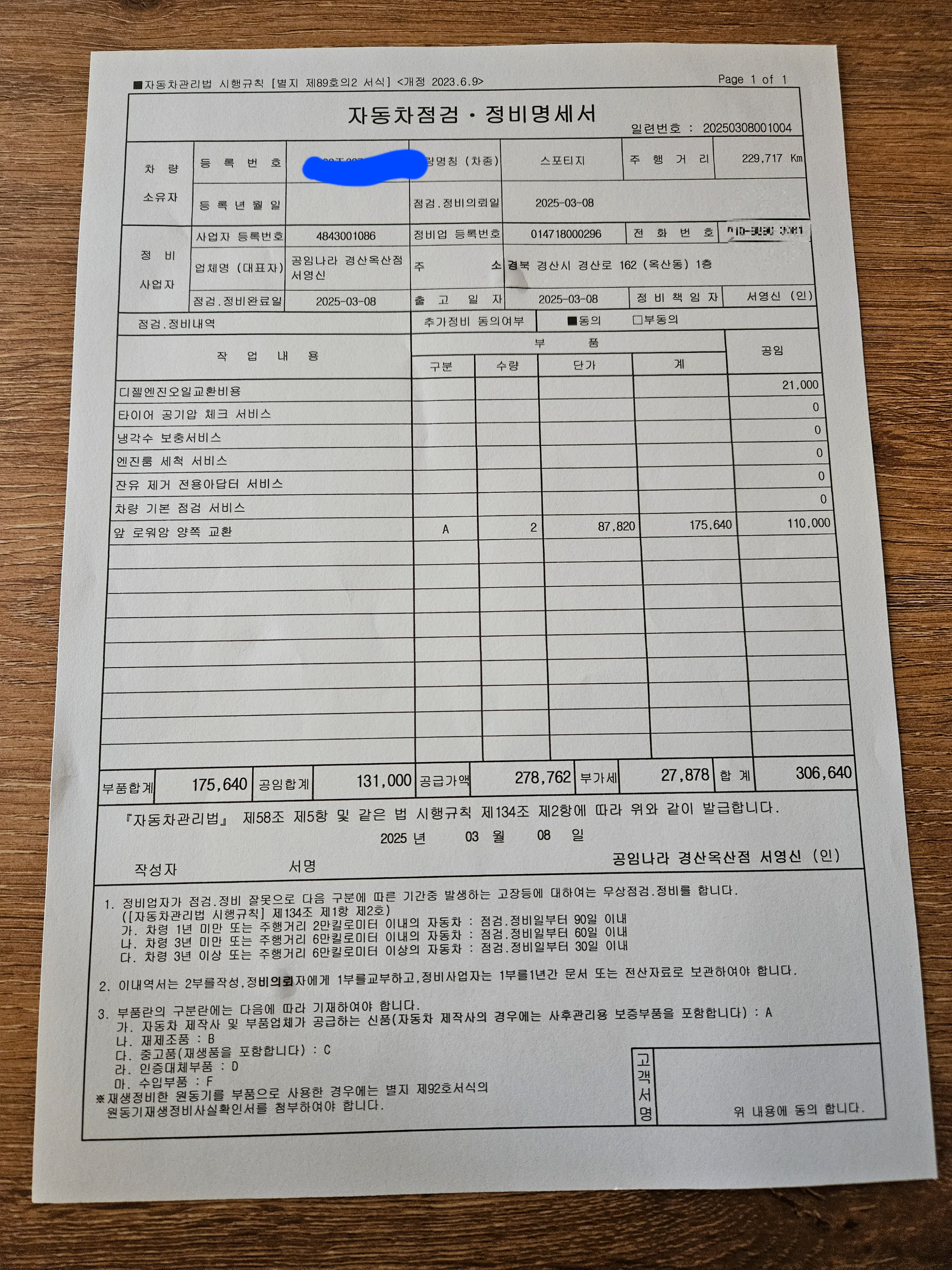 혹시 다른 부품도 같이 정비를 봐야 하냐고 여쭤봤으나, 딱히 그럴 필요는 없다고 하셨다.
