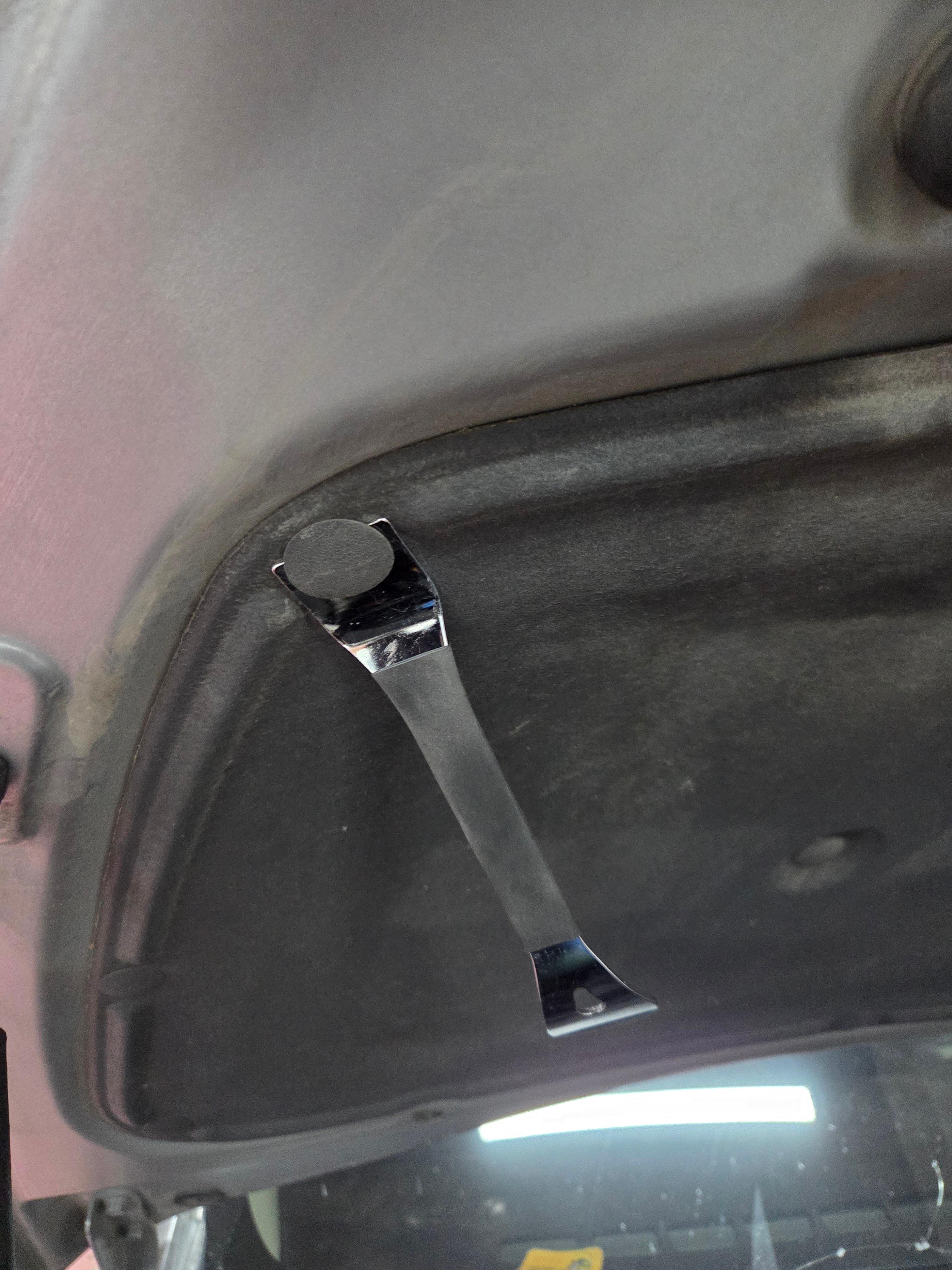 그리고 옷걸이를 ' 보닛 후드에 있는 고무(범퍼 - 후드 오버슬랩)' 자리로 넣어서, '후드 인슐레이터(보닛 방음판)에 끼워져 있는 클립' 자리에 오도록 한 다음, 볼트(볼 조인트-후드 리프트)와 결합한다.