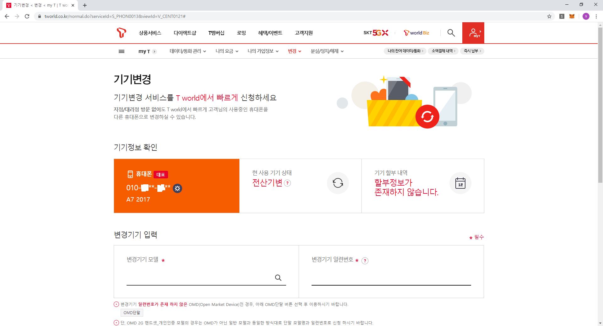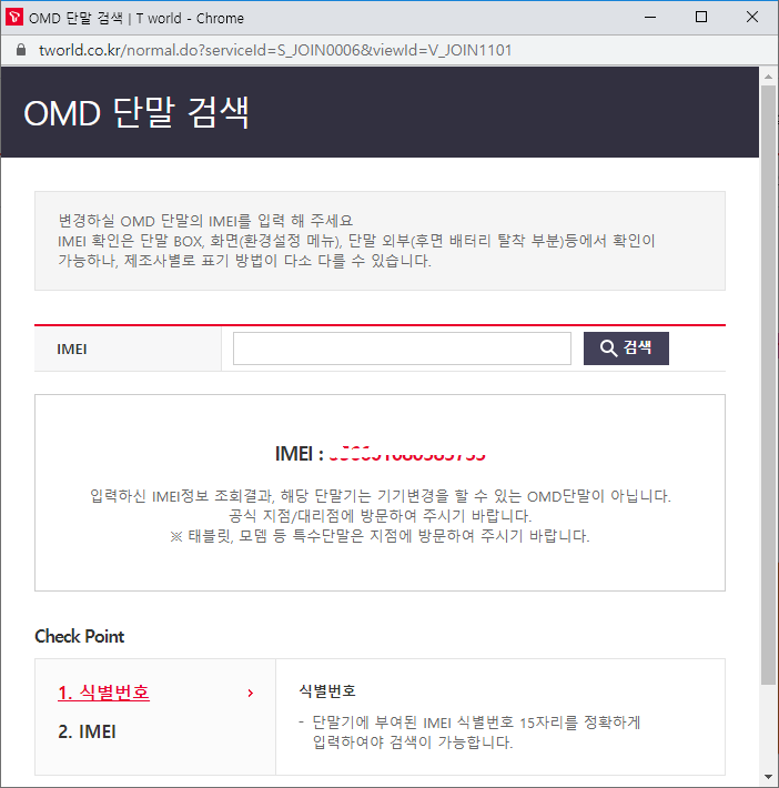 티월드의 기기변경 화면에서 OMD 단말을 선택 후, 아이폰SE의 일련번호를 넣어 보았다.