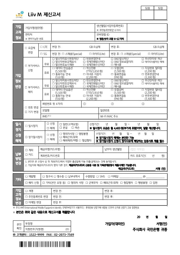KB국민은행 홈페이지 > 고객센터 > 서식/약관/설명서 > 기타 접속후 Liiv M 제신고서 출력후 정보기재하신다음 FAX 발송 혹은 사진 촬영 후 문자 발송 부탁드립니다.