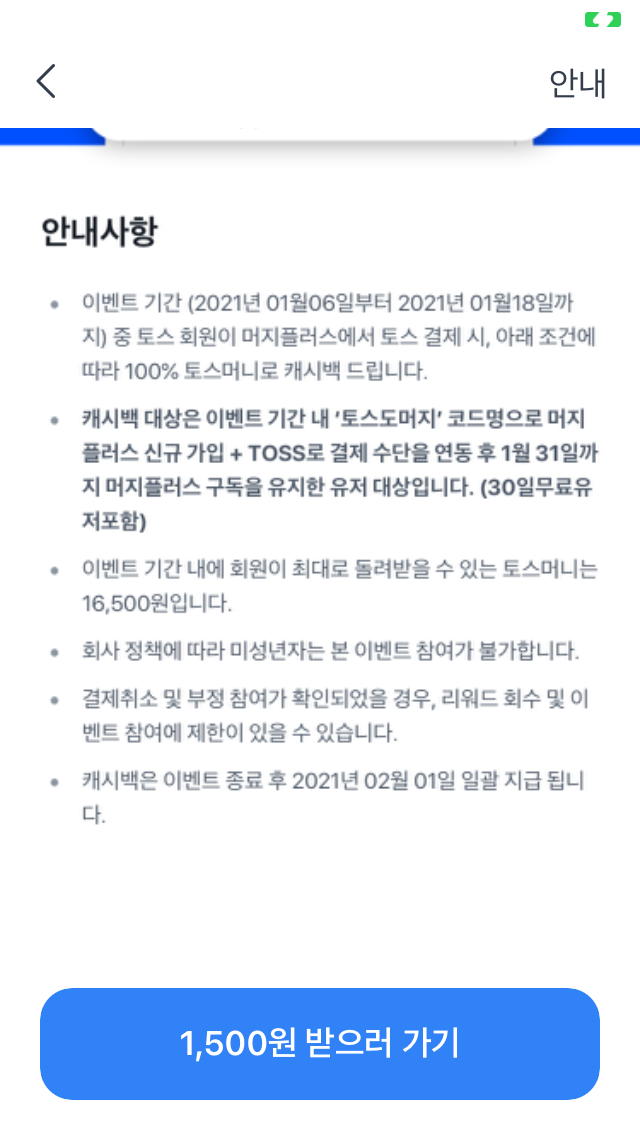 4. 2/1(월)에 토스머니가 입금되고 나면, 머지플러스를 해지할 것(해지하지 않으면, 유료멤버십을 계속 이용)